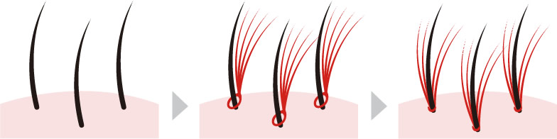 太くて健康な自毛に特殊加工を施した形状記憶(ウィングループ)4本の人工毛を専用の器具(スピードアップニードル)を使用して結んで増毛します。専用の器具を使用することにより短い髪にも増毛が可能です。